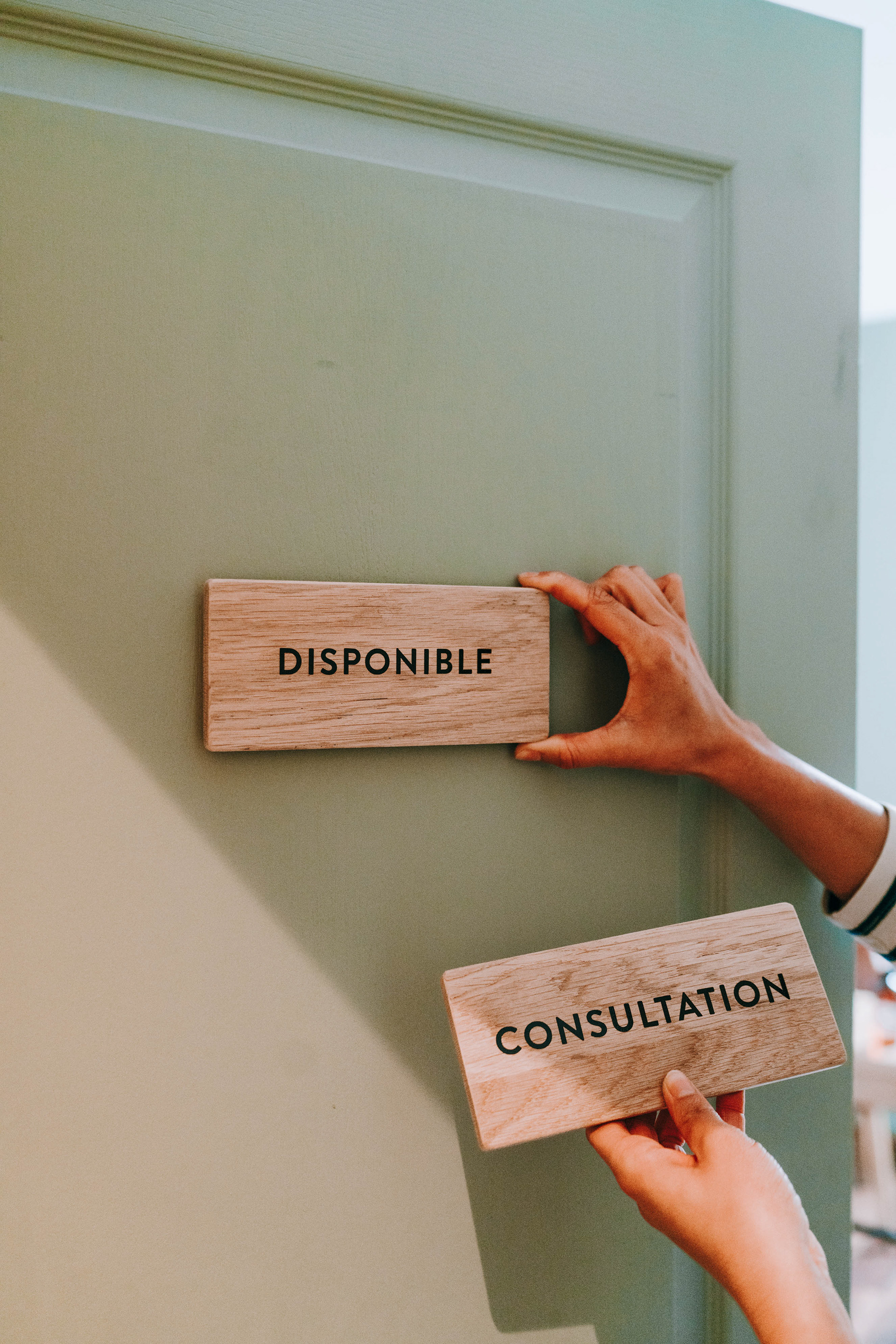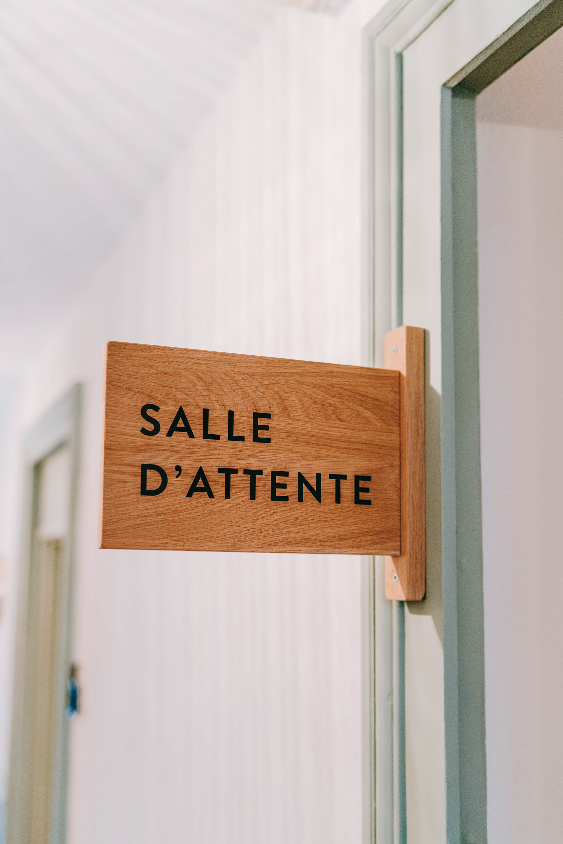 Une première plaque, fixée en hauteur, permet d’identifier dès l’entrée du bâtiment la salle d’attente. Les portes des cabinets sont équipées d’un système aimanté, permettant de changer facilement la signalétique selon l’occupation.